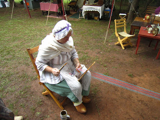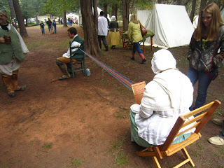 All around the camp, the women had their hand work in their laps. Knitting, crocheting, sewing, and spinning was everywhere. We saw skeins of yarn, mainly yellow, brown, blue, and red, that had been hand dyed. These colors were popular during colonial times because the available plants and nuts to make them were in the yards and herb gardens.