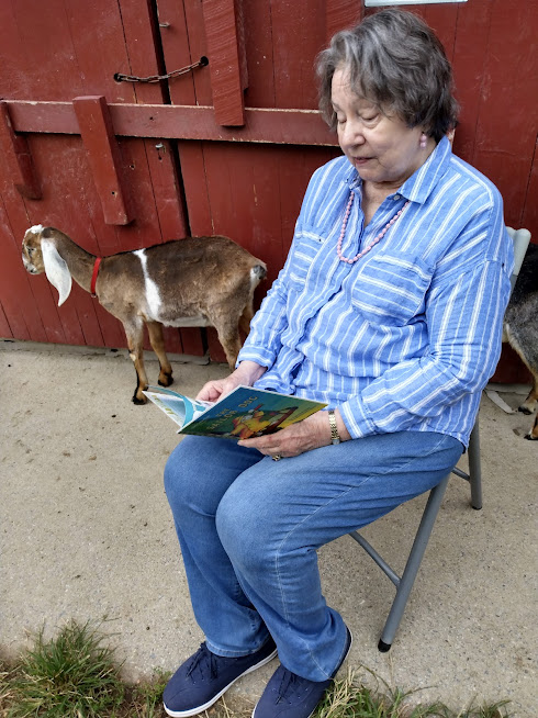 I read to two Nubian kids. They were born this spring and were being weened from their mothers. The Superintendent told me they were fearful and a bit skittish. She kindly offered me her chair. Other than an easy raise of their heads from their grass-nibbling of tufts , they paid me little mind.