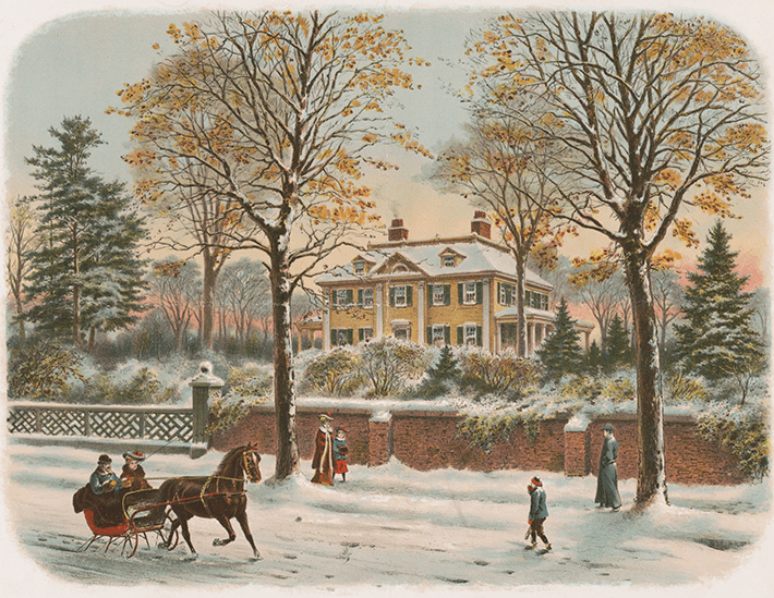 Print depicting a winter scene at Henry Wadsworth Longfellow’s home in Cambridge, Massachusetts. Library of Congress